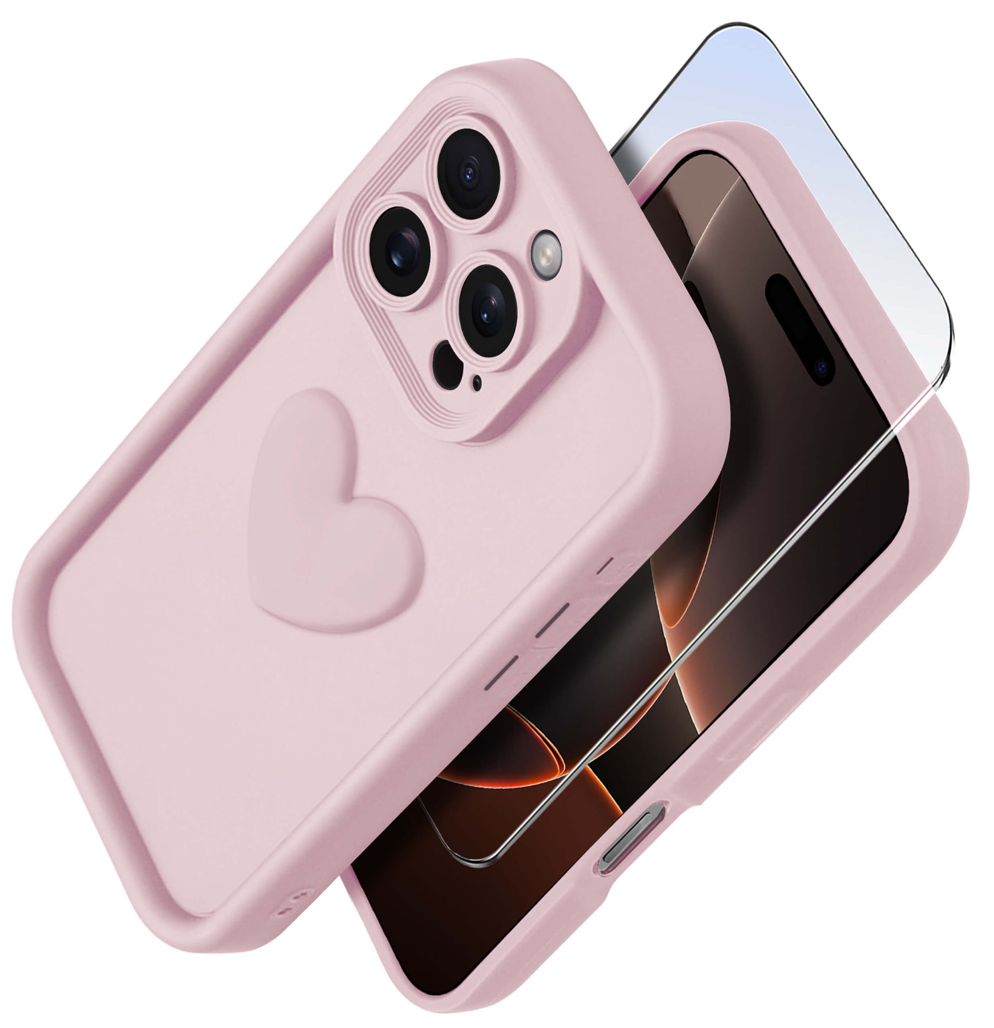 Etui do Iphone 16 Pro Max silikonowe serce jasnoróżowe ze szkłem