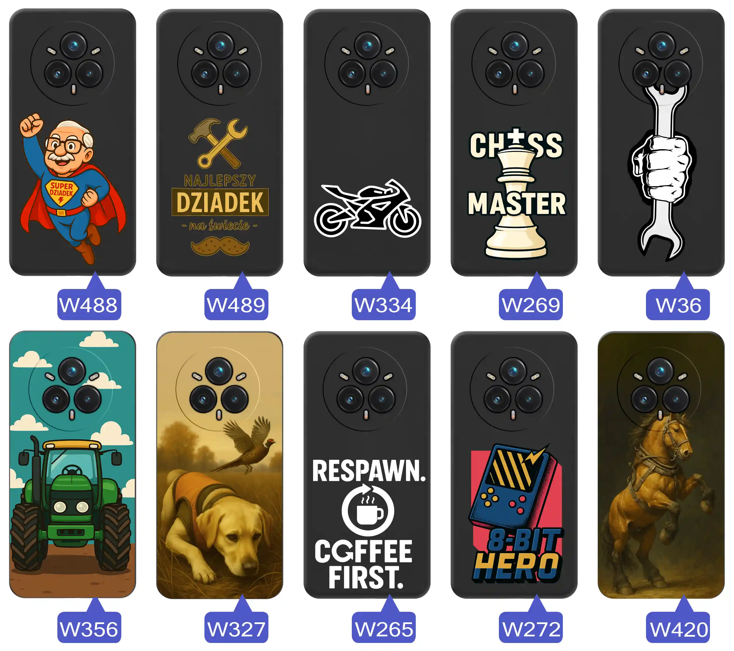 Motywy: Super Dziadek, narzędzia, szachy, motocykle, traktor, pies, koń, kawa, retro gaming