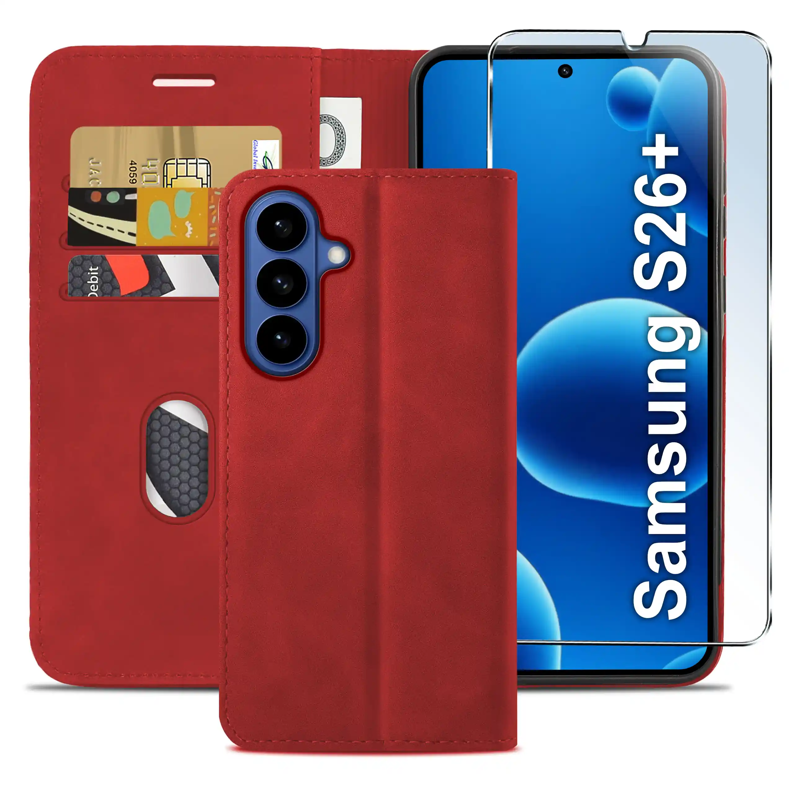 Etui do Samsung Galaxy S26+ Plus z klapką skórzane Velvet czerwone ze szkłem