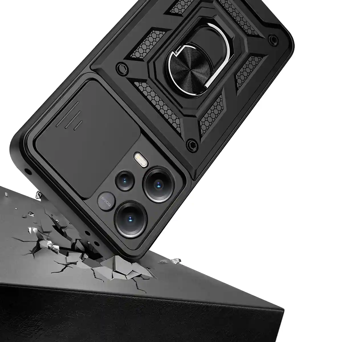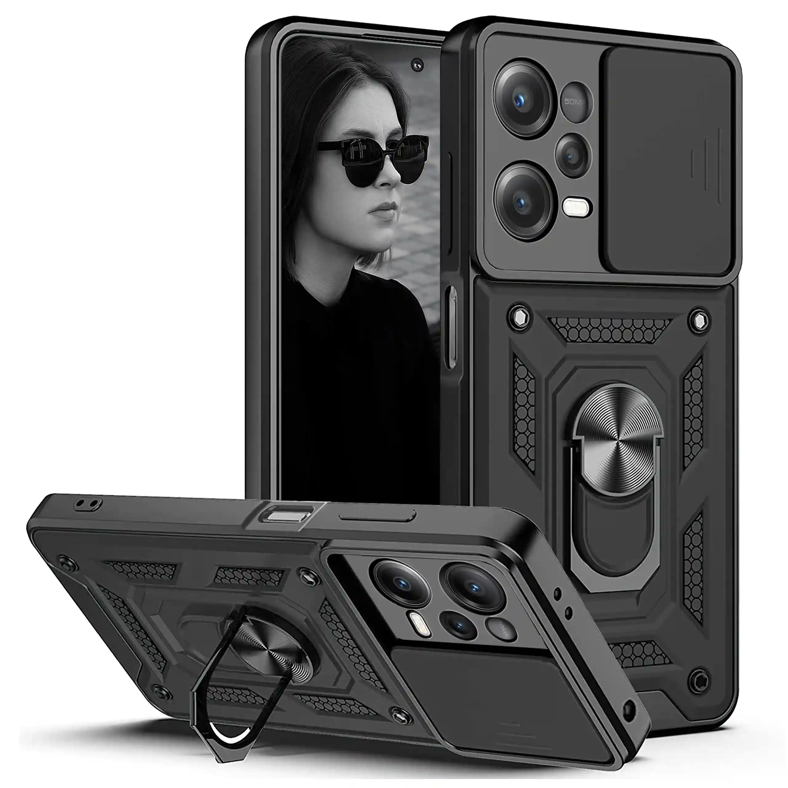 Etui pancerne ring do Xiaomi Redmi Note 12 Pro czarne z osłona na aparat + szkło